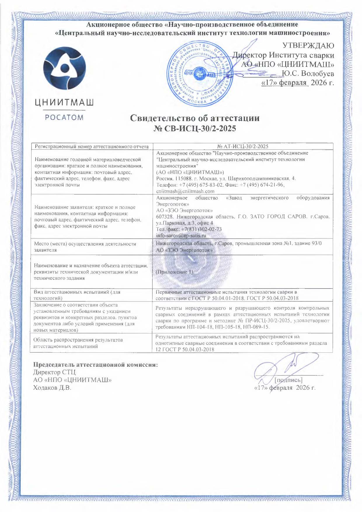 По результатам аттестационных испытаний АО «НПО «ЦНИИТМАШ» оформило и выдало свидетельство об аттестации № СВ-ИСЦ-30/2-2025 от 17.02.2026.